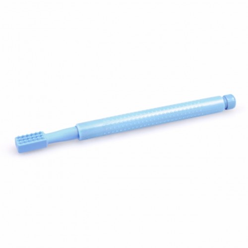 The Z-Vibe®'s sleek, innovative design features a lightweight, plastic handpiece with gentle bumps around its circumference for a non-slip grip. This texture can also be brushed along the cheeks, arms, hands, etc. for additional tactile input. The handle comes with a blue Probe Tip on one end and a Switch Tip on the other. Use the Probe Tip for oral motor assessment and development. This end of the handle is sealed off from the internal components so that no saliva, water, or moisture can compromise the unit from that end. To turn the unit on, simply twist the Switch Tip at the opposite end of the handle just until the unit starts to vibrate (please do not over-tighten!). This end of the handle is open so that you can easily replace the battery when necessary. The Switch Tip can also be replaced with any other tip in order to use two tips simultaneously. Choose from over 35 optional tip attachments (sold separately) to create a custom therapy tool. From brushes to spoons to pencils and more, the possibilities are endless!