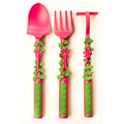 Í settinu má finna hnífapör sem samanstanda af gaffal, skeið og ýtu sem eru skreytt með álfum og blómum. Hnífapörin eru látin líta út eins og garðáhöld.
